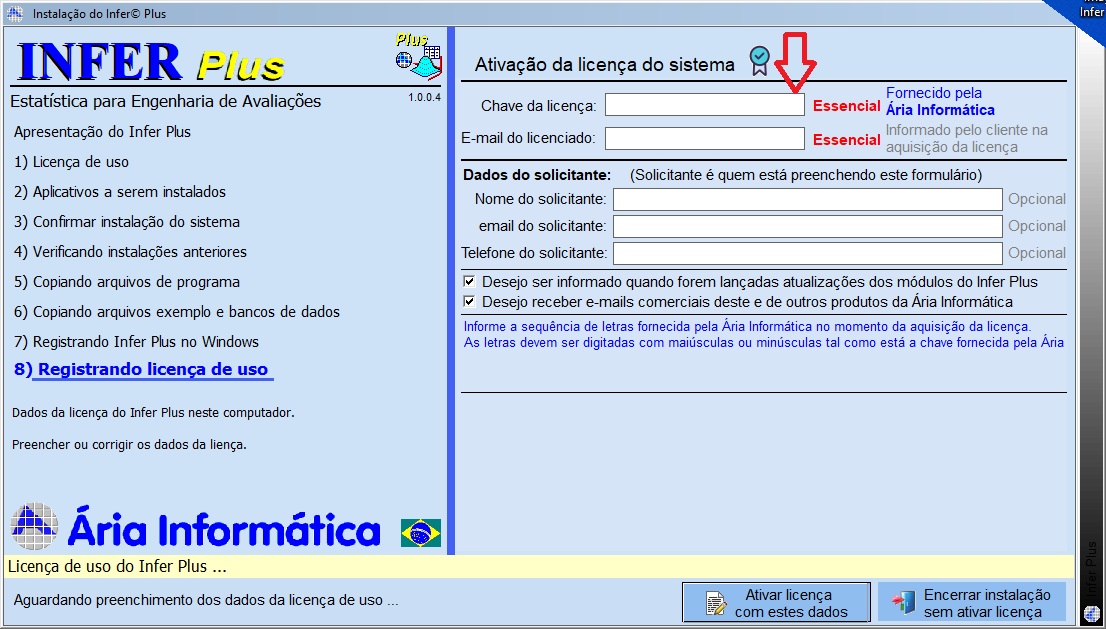 • Insira os dados da sua licença do INFER Plus: Chave da licença, o E-mail do licenciado, os Dados do solicitante, depois clique em “Ativar licença com estes dados”.